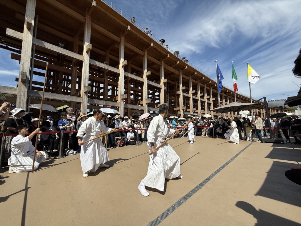 今回のイタリア館前での演武は、近衞忠大氏が展開する『伝統文化の継承と普及を軸とした法人活動を通じて、文化外交における日本の価値を継続的に高めることを目指す活動の一環として協力・開催した「武士の学校」』によるつながりで実現したものです。多くの日本人・訪日外国人の歓声・拍手を頂くなど、まさにこの主旨に沿ったイベントとなりました。